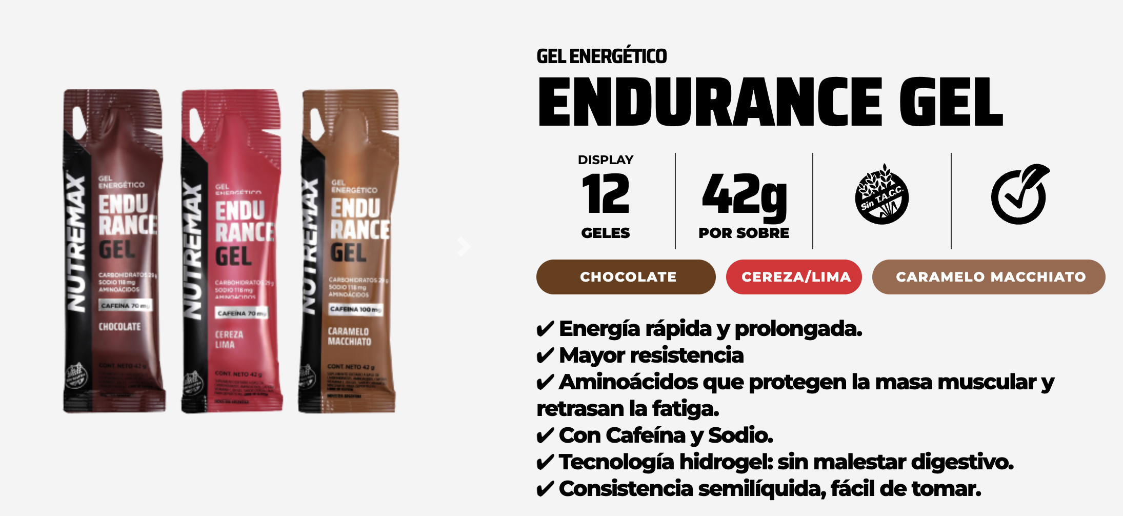 ENDURANCE GEL de Nutremax es más que un gel energético. Combina 29 g de carbohidratos en una proporción 2:1 de maltodextrina y fructosa, con isomaltulosa Palatinosa, 120 mg de sodio y un exclusivo aporte de 1200 mg de aminoácidos funcionales (BCAA, taurina y citrulina). Una fórmula diseñada para quienes necesitan energía, resistencia y protección muscular durante esfuerzos prolongados.