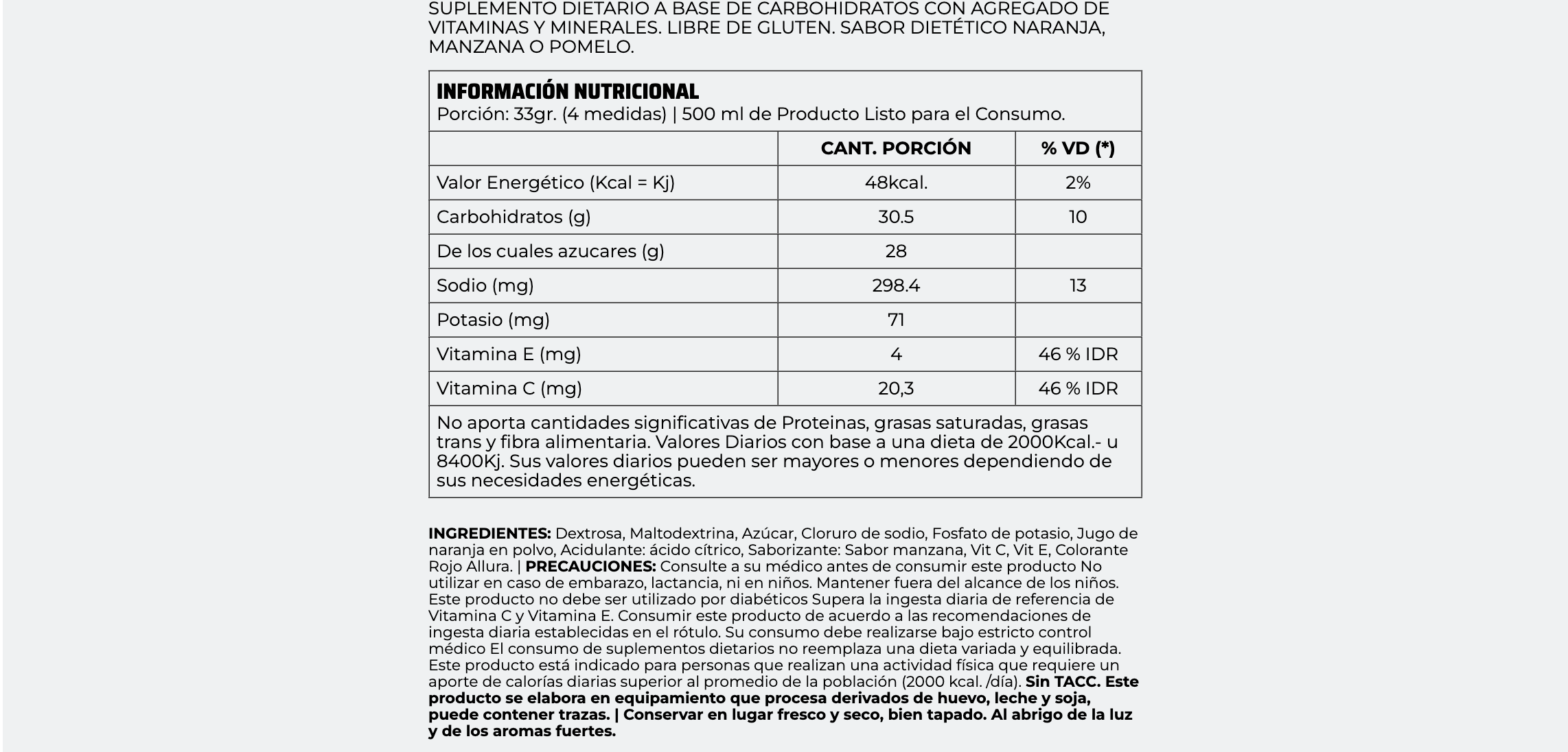 Su exclusiva fórmula, fuente de vitaminas C y E, aporta carbohidratos, retrasa la fatiga y mejora el rendimiento físico.